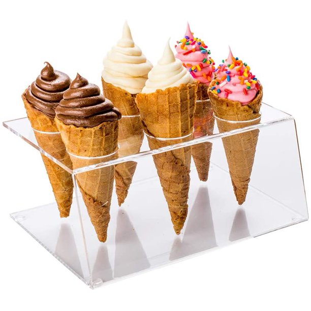 Ice Cream Cone Holder Display - As per your requirements we can design this type of acrylic cone display units.. Our freestanding cone guard hold 5 cones, and comes with your choice of holes to fit standard sugar cones or larger waffle cones. Please see terms for more information. Order now, make the best dessert presentation and create the most why don't you use our ice cream cone cupcake holder? 8 holes detachable graduation practical transparent display home party kitchen stand acrylic ice cream cone holder diy reusable. Our customized ice cream cone holders have the perfect shape to fit the maximum number of cones and are resilient enough to withstand moisture these boxes are crafted with extreme delicacy and sensitivity to prevent cones from getting crumpled or slipping away.